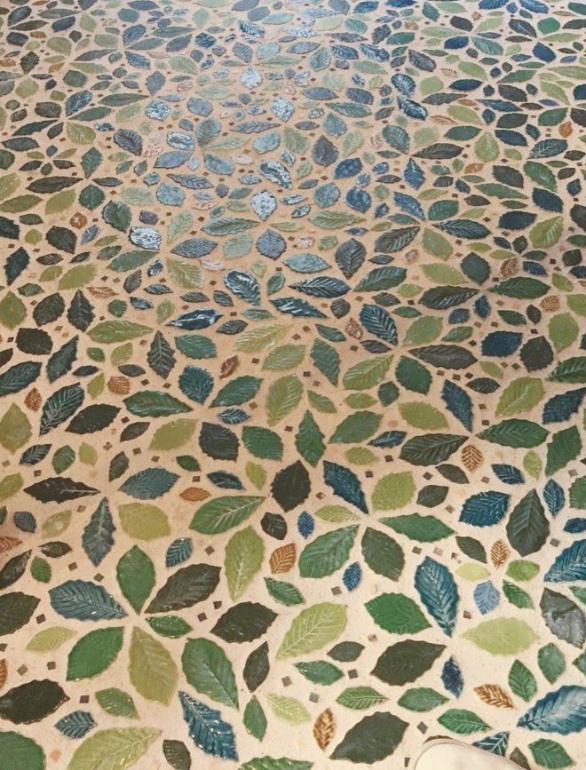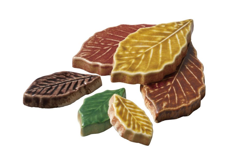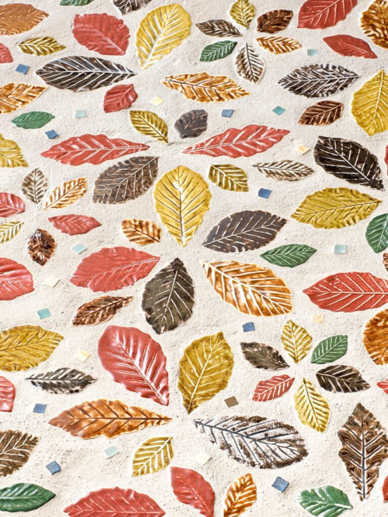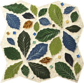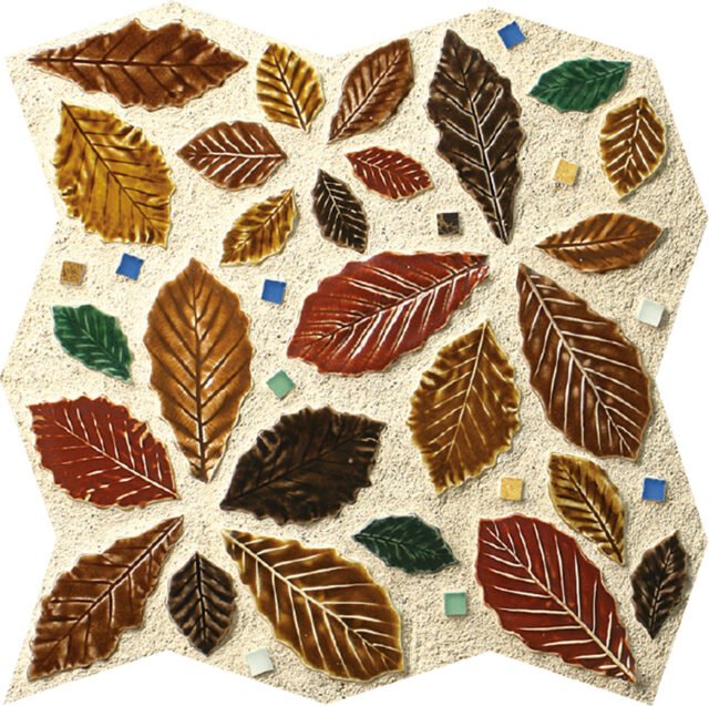 นำเสนอกระเบื้องสองรูปแบบและหลายโทนสีในแผ่นเดียว ถ่ายทอดบรรยากาศแห่งฤดูใบไม้ผลิและฤดูใบไม้ร่วง โดยเฉพาะการผสมผสานกระเบื้องแก้วขนาด 10 มม. กับหินอ่อนในลวดลายใบไม้ ช่วยสร้างความรู้สึกอ่อนโยนและน่ารัก